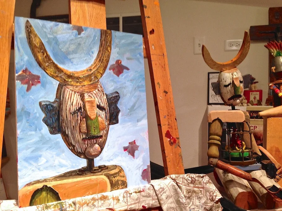 "Release with Bees," painting in process. Here you can see me working from the actual sculpture, with the bees just beginning in the image.